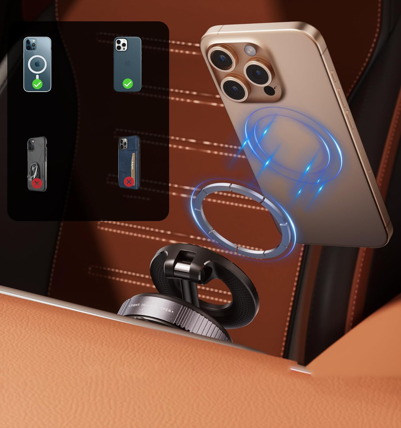 Uchwyt działa z każdym telefonem – iPhone 12–16 mocujesz bezpośrednio, a do telefonów bez magsafe wystarczy przykleić dołączony metalowy pierścień.